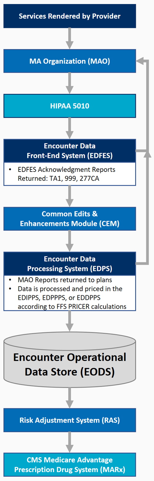 MAO submits the encounter data in the HIPAA compliant version 5010 837X format transaction file to CMS.